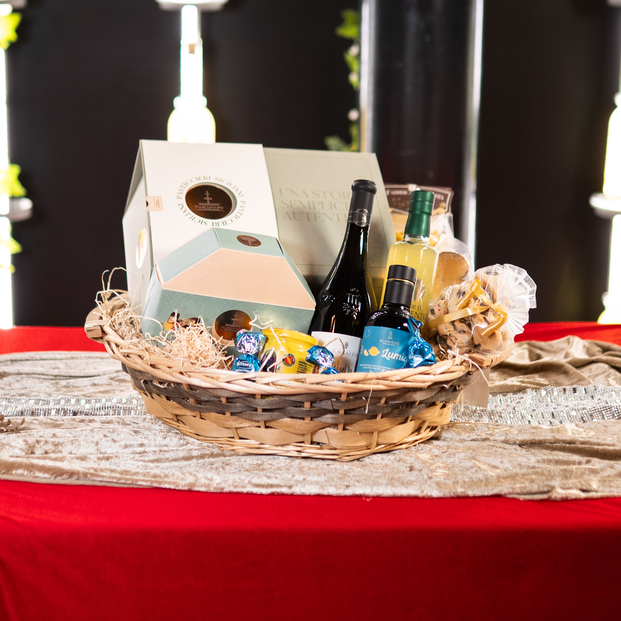 biscotti siciliani di Castelvetrano, buccelato siciliano, olio d’oliva siciliano aromatizzato al limone, caponatina di melanzane, pasta di gragnano al limone, caciocavallo stagionato, panettone fiasconaro oro verde, torroncini sicilian, vino bianco di nera, limoncello.
