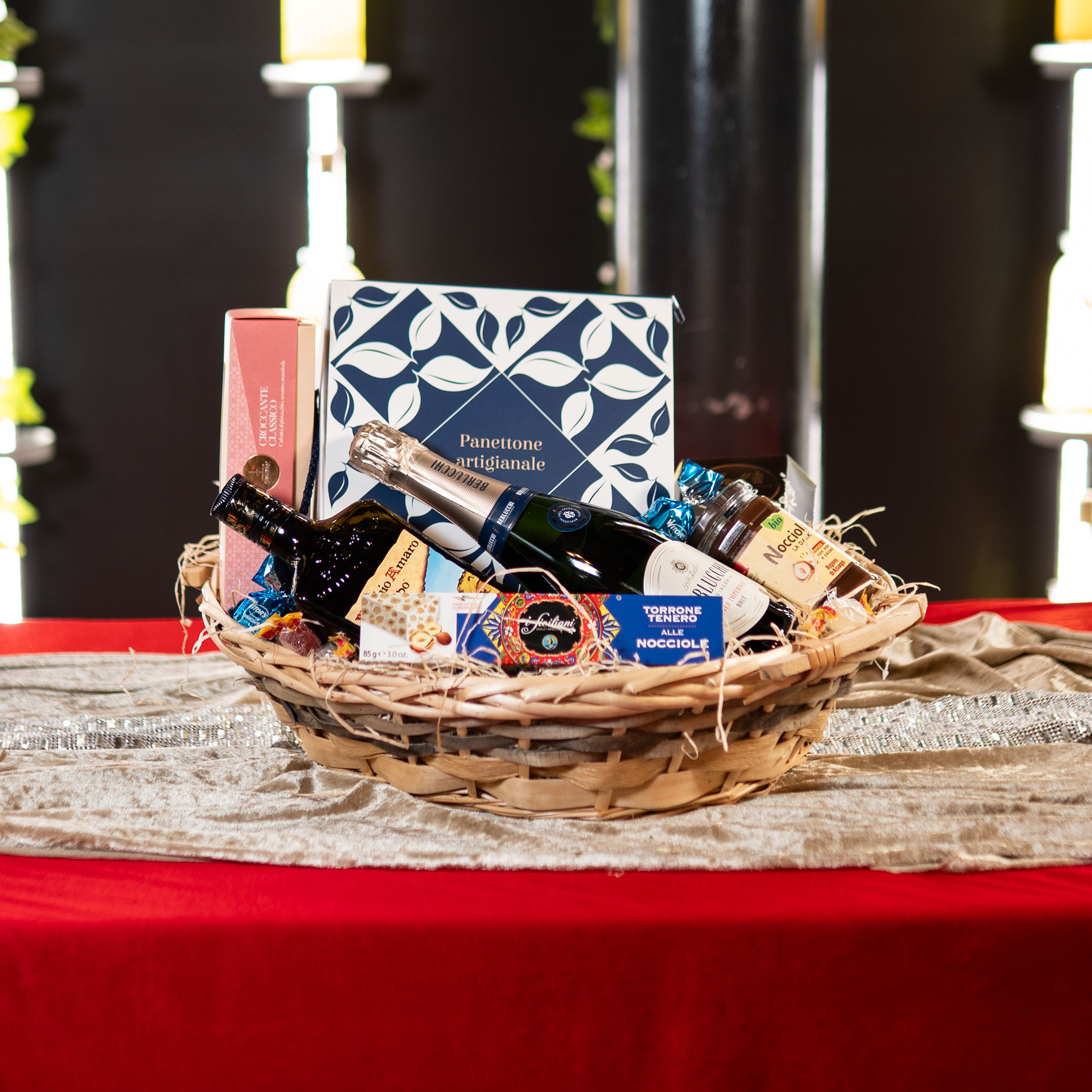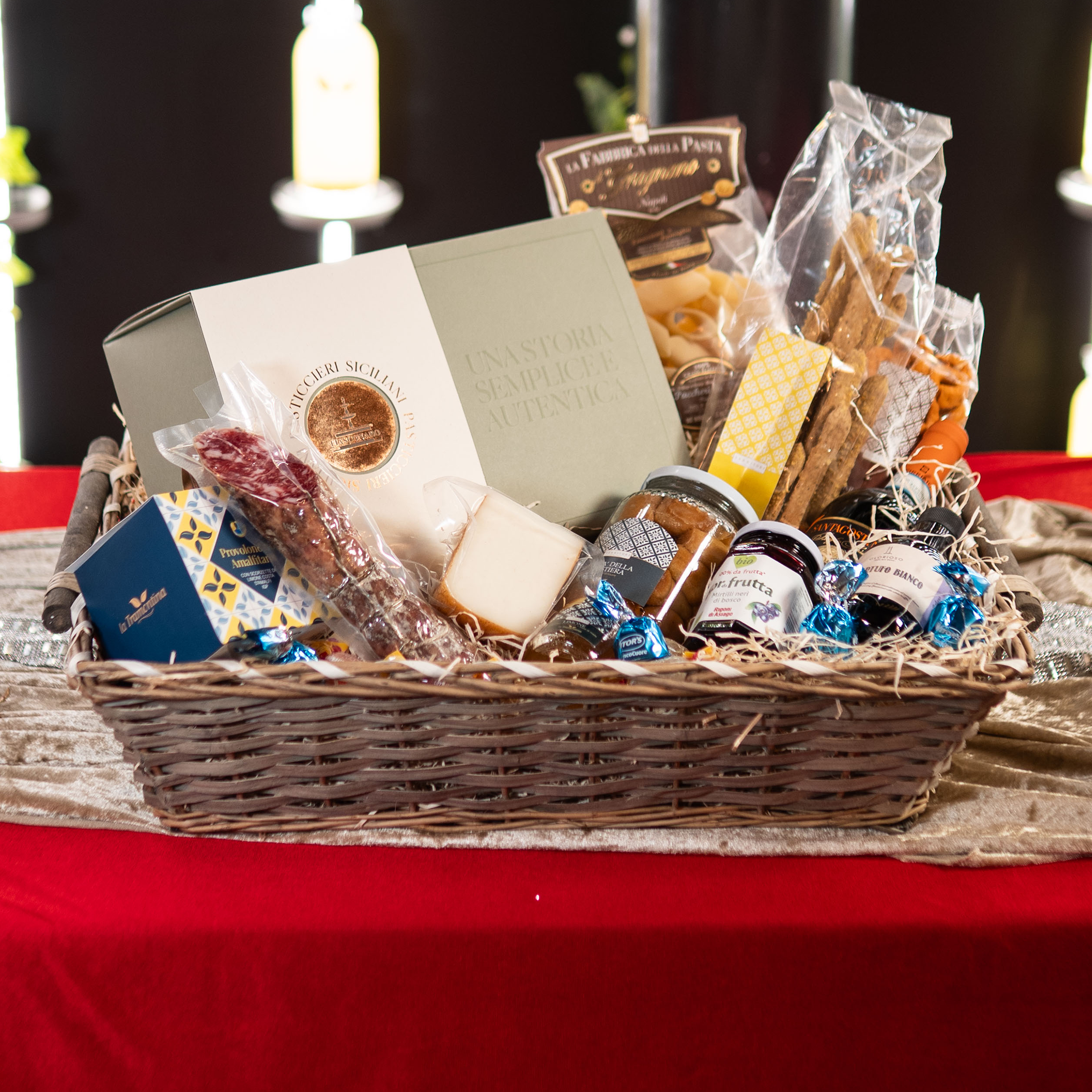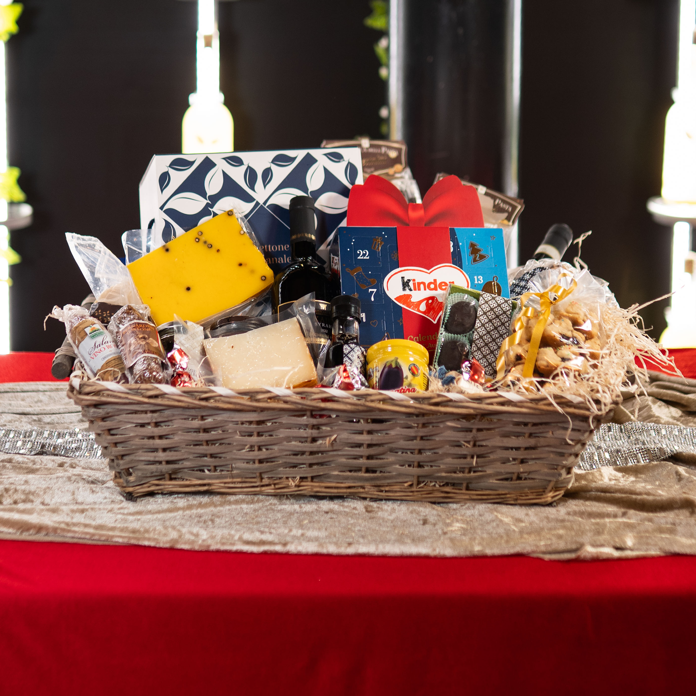 salamino al vino rosso, salame al tartufo, piacentino ennese, cacio stagionato in grotta, colatura di alici di cetara, vino kaid, vino amarone, miele aromatizzato, caponatina di melanzane, panettone artigianale, pasta di Gragnano, buccelato siciliano, calendario dell avvento kinder, Fichi glassati al cioccolato fondente, nocciolata, cioccolatini e caramelle.